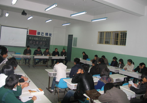 2008年11月10日晚9点,在电力试验楼三楼,电子与电气工程系召开了本学期的师生座谈会,系副主任葛跃田、辅导员林琼、鲁志刚、电力教研室主任胡小东、自动化教研室主任李向江、何银光等老师及07、08级每班五名学生代表参加了本次座谈会。