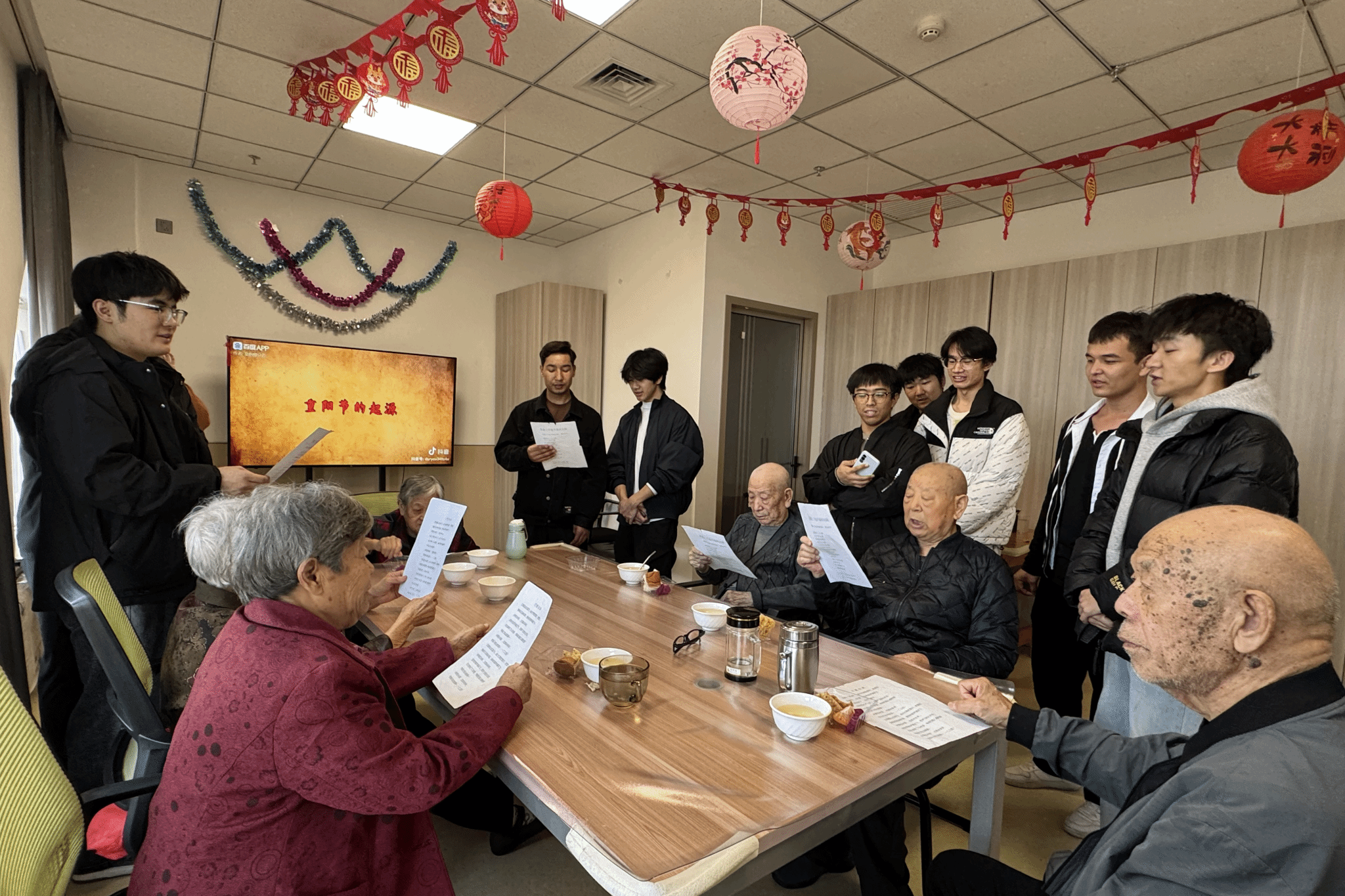 除了精彩的互动联欢,志愿者们还主动承担起养老服务中心的志愿服务工作。他们拿起抹布仔细擦拭窗户、认真整理活动室桌椅,积极帮忙搬运物品,用勤劳的双手为老人们营造整洁舒适的环境。“这些孩子就像自家孙辈一样贴心,不仅陪我们说话,还帮我们解决实际问题,心里特别暖。”78岁的张奶奶笑着说道。