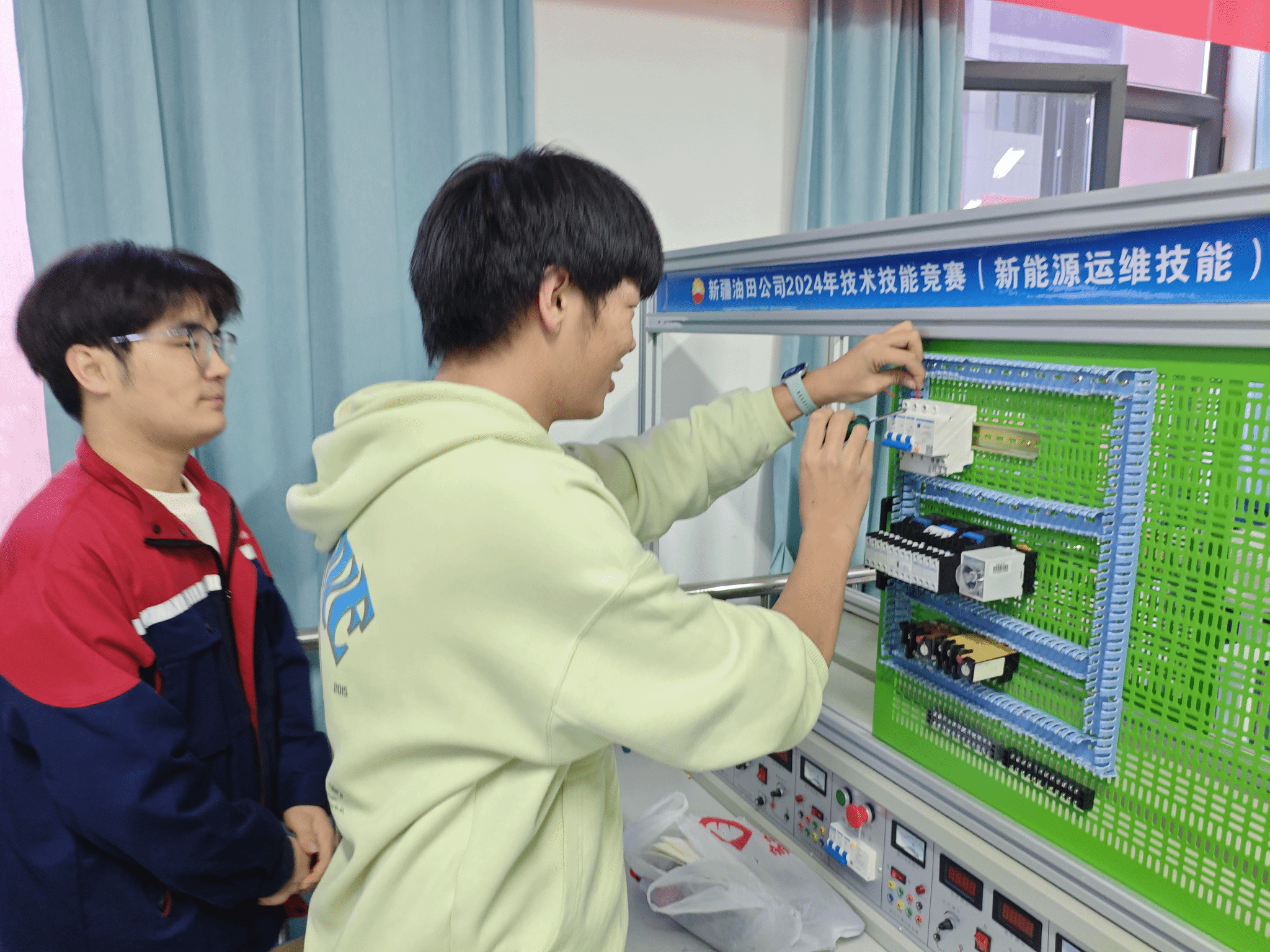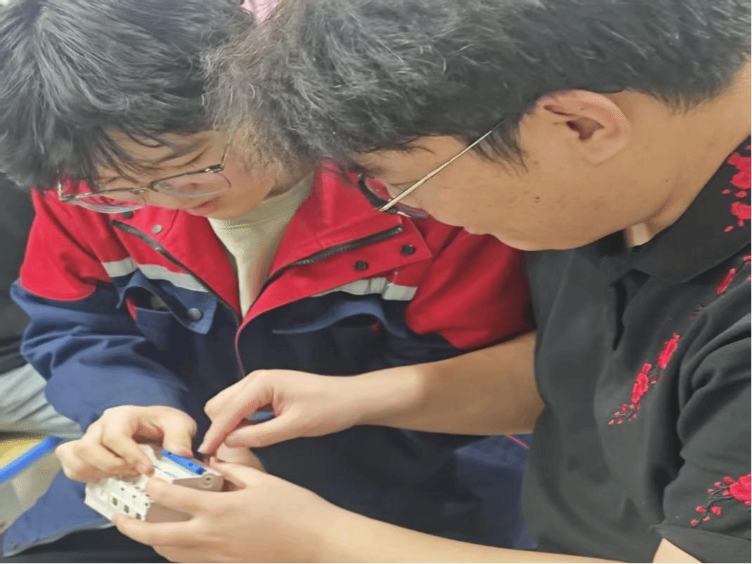 实操环节中,同学们需在规定时间内完成“手绘图纸 + 实物接线”两项核心任务。在画图与锯线槽阶段,大家严格遵循电气制图国家标准,结合给定控制要求精心设计图纸,精准切割线槽,充分展现了扎实的专业理论功底;接线环节中,同学们手持工具对照图纸,有条不紊地进行断路器、接触器、按钮、指示灯等元件的接线操作,布线规范、接线牢固,在实践中摸索技巧、攻克难点。杨佳辉、高长龙等工作人员全程穿梭在各小组间,及时分发物料、协助调试设备,学长们则针对剥线长度不当、接线松动等常见问题进行一对一指导,纠正不规范操作,助力同学们稳步提升实操技能。